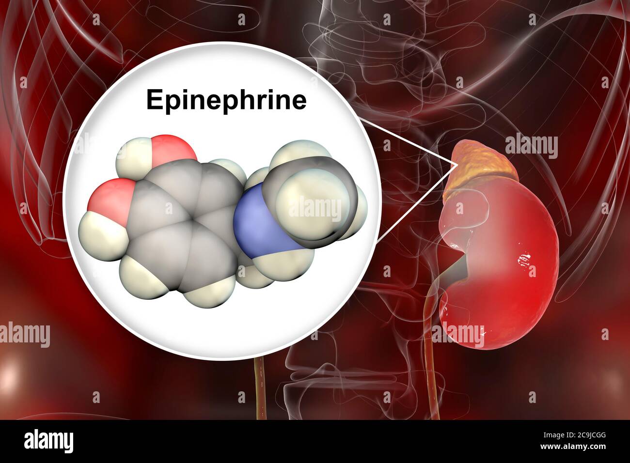 Illustration of an adrenal gland and molecular model of adrenaline