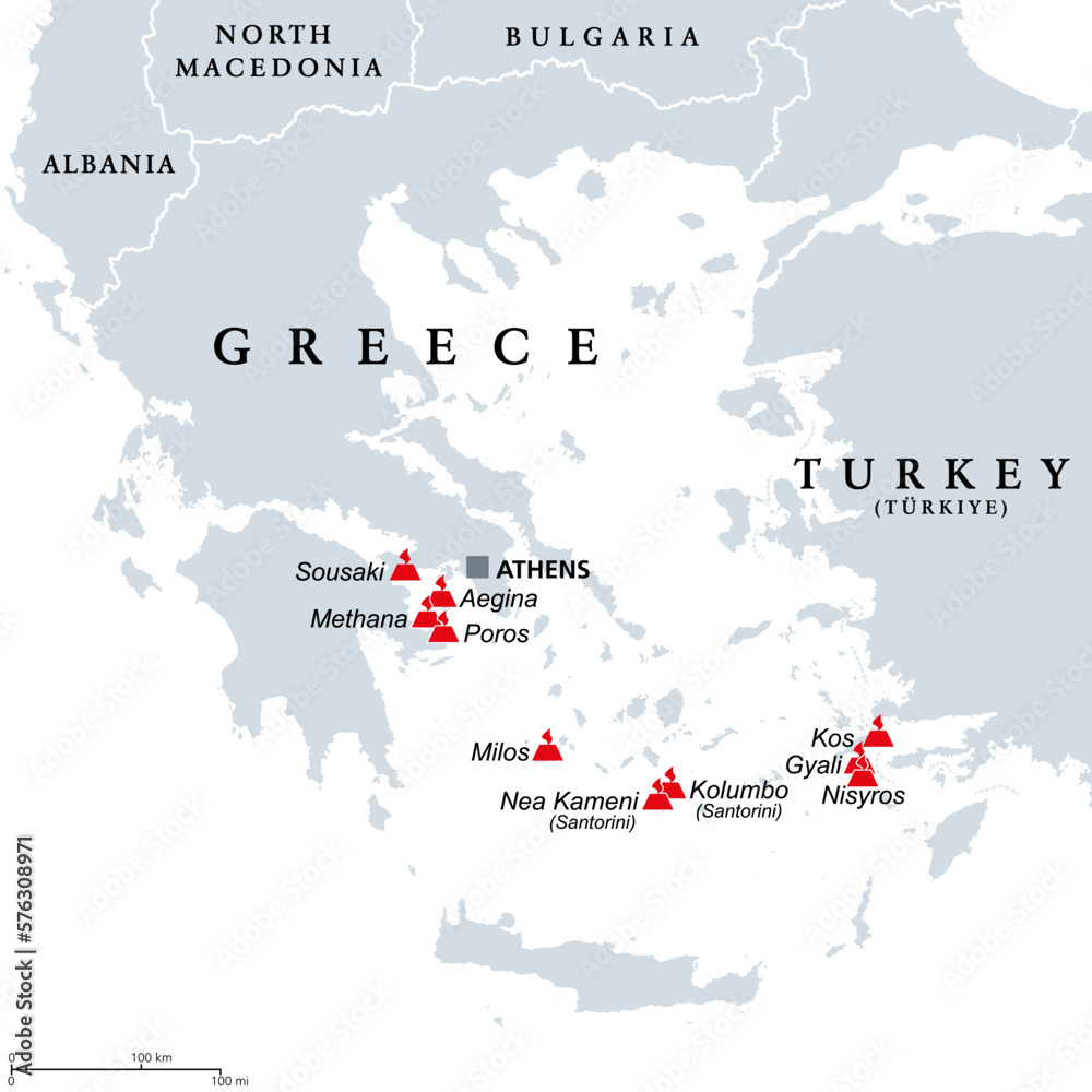 Greece Active and Extinct Volcanoes in the Aegean Sea Region Map