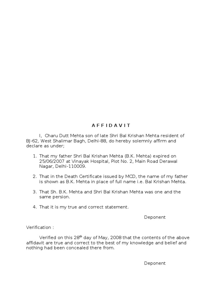 Affidavit Format for Obtaining Death Certificate of the Deceased
