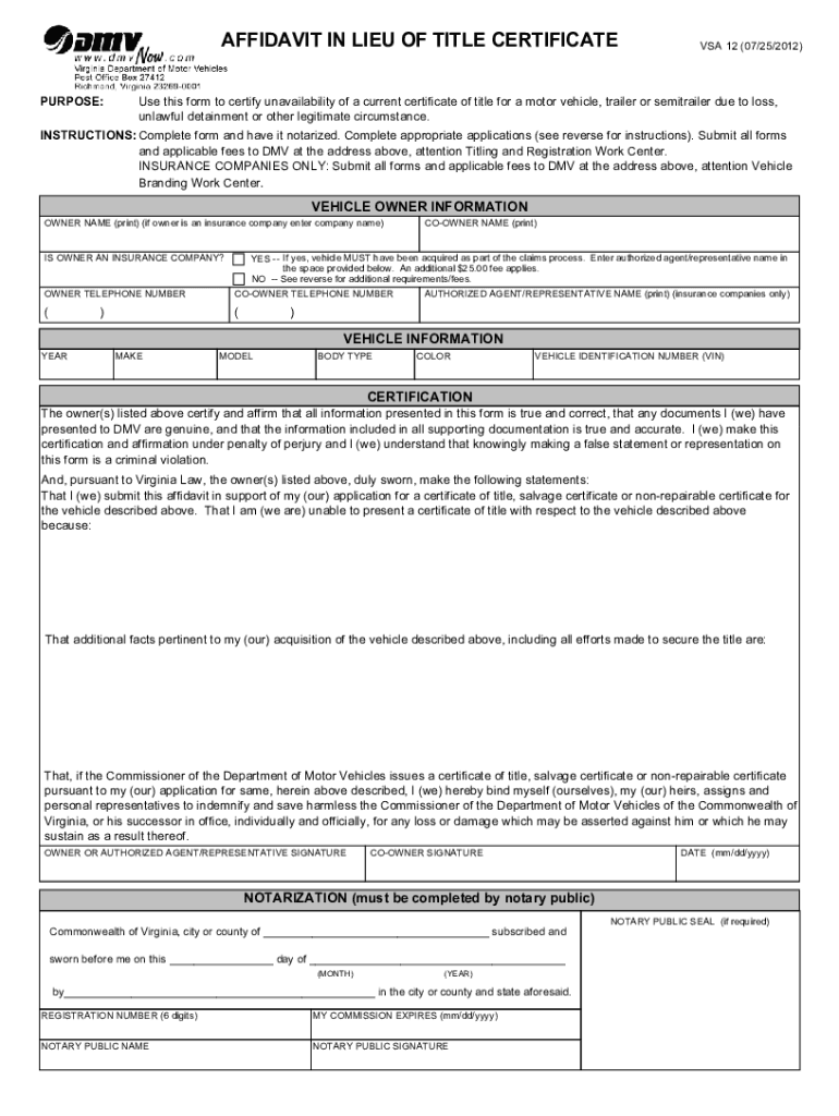 Fillable Online Free Virginia Affidavit in Lieu of Title Certificate