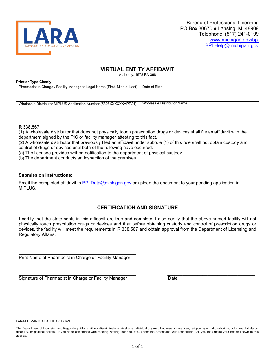 Form LARA/BPL VIRTUAL AFFIDAVIT Fill Out Sign Online and Download