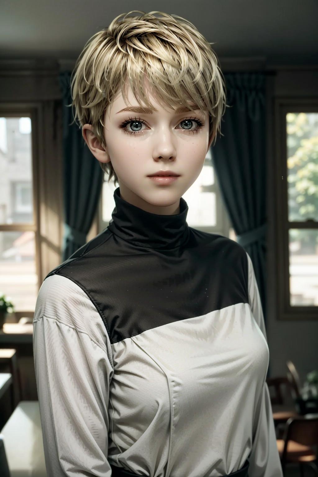Close up of a woman with pale blonde hair facing a humanoid robot