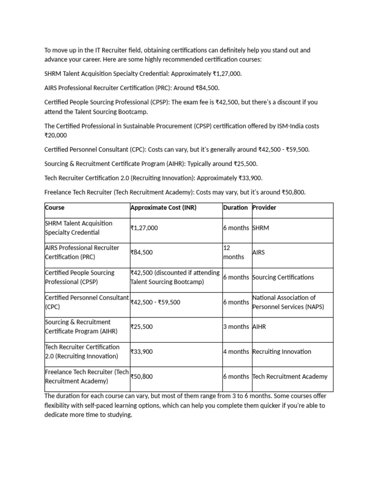 Top IT Recruiter Certifications Costs PDF Certification