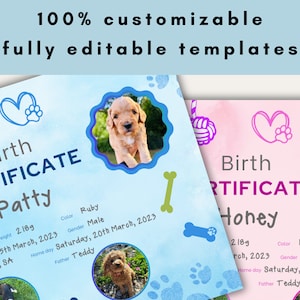 PUPPY BIRTH CERTIFICATE Dog Whelping Editable Printable Pet Adoption