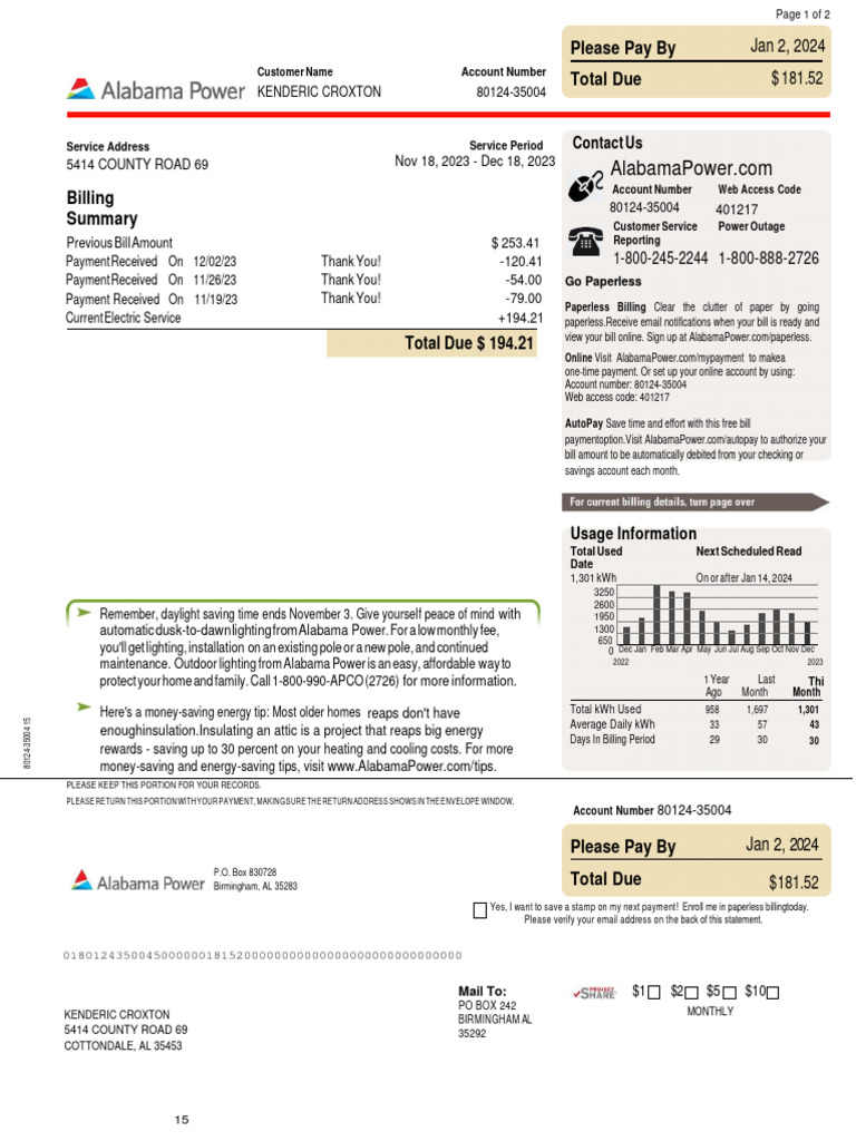 2024 Alabama Power Electricity Bill MbcVirtual Bill template