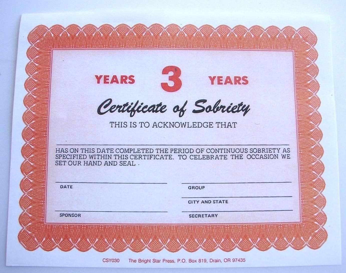 Alcoholics Anonymous AA Medallion Token Certificate of Sobriety 3 Year