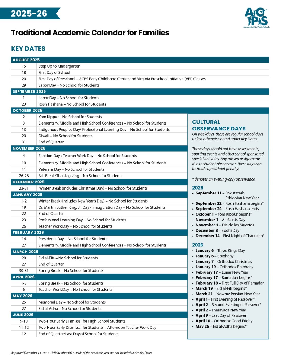 Alexandria PTAC The 2024 25 ACPS school calendar is now