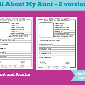 All About My Aunt Printable Mother s Day Printable Gift for Her From