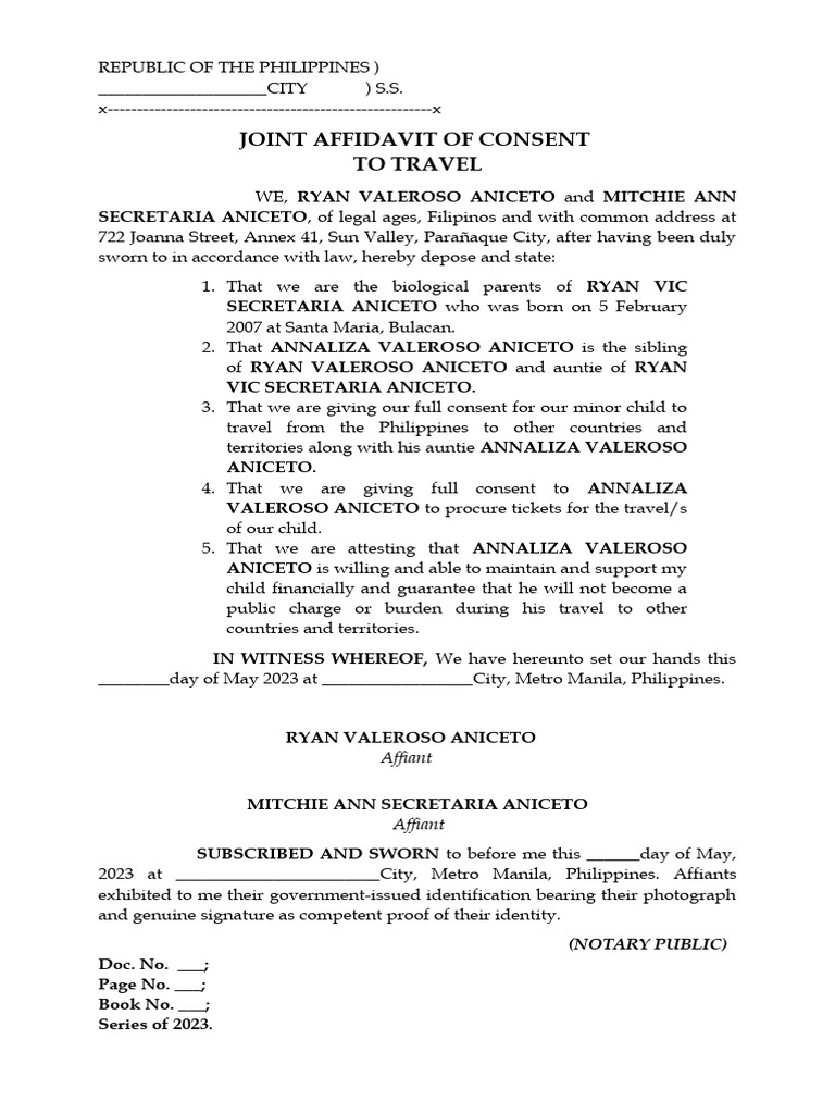 Affidavit of Consent To Travel PDF Affidavit Notary Public