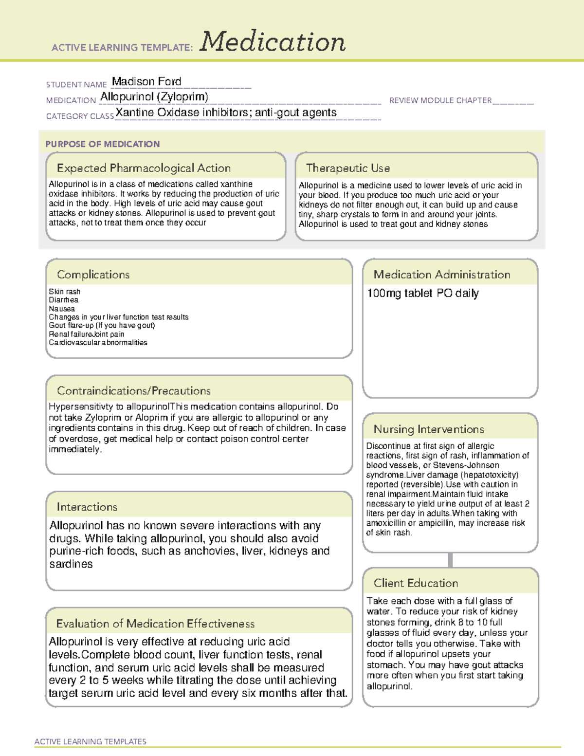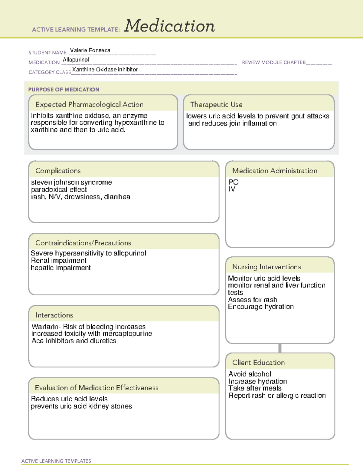 Allopurinol ACTIVE LEARNING TEMPLATES Medication STUDENT NAME Studocu