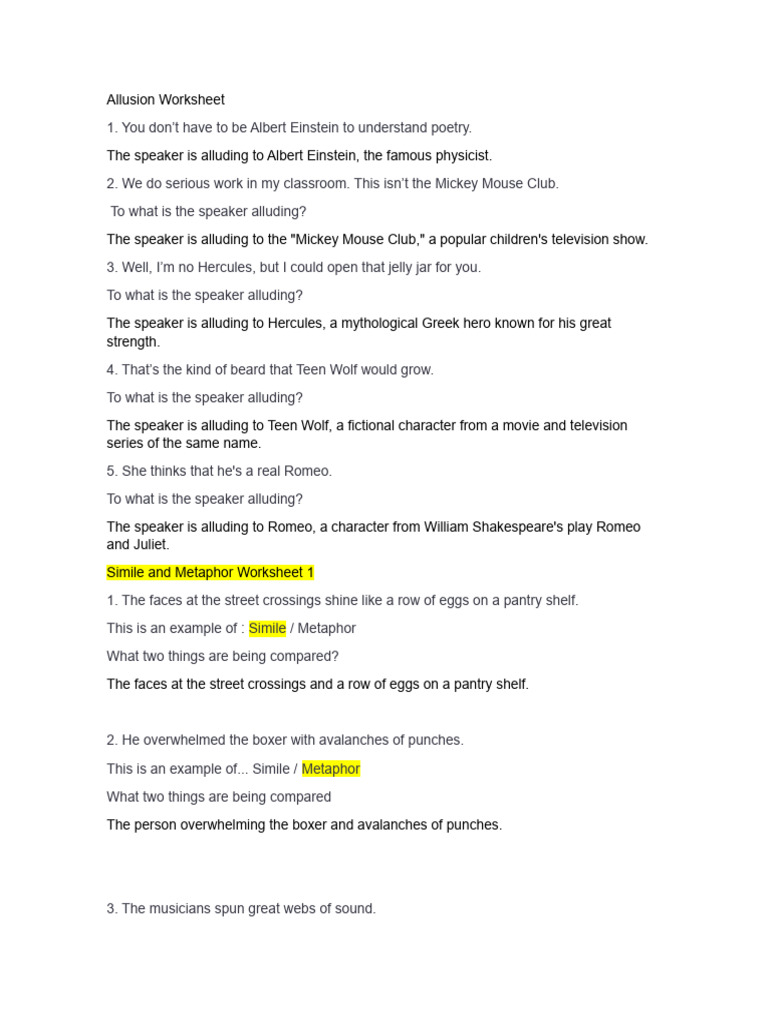 Allusion Worksheet Answers Allusion Worksheet And Answer Key Teachers