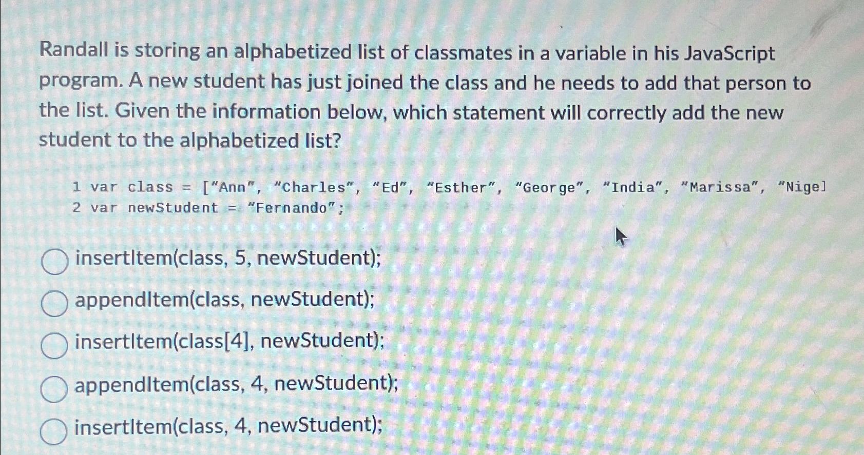 Solved Randall is storing an alphabetized list of classmates Chegg com