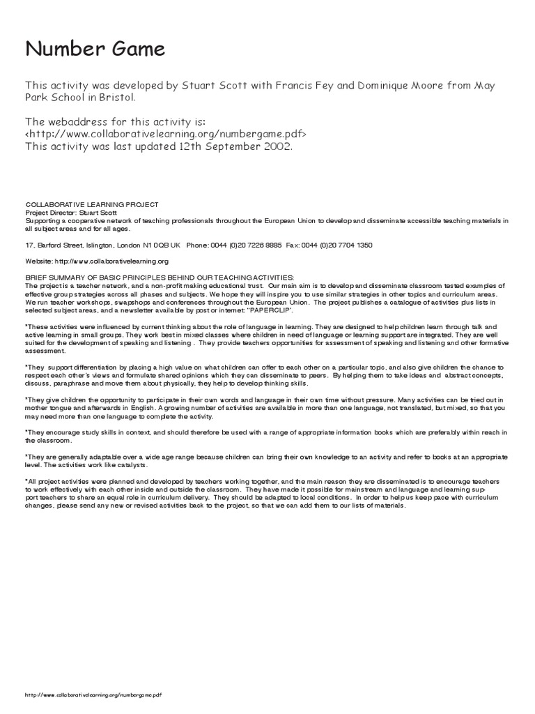 Numbergame PDF Teachers Curriculum