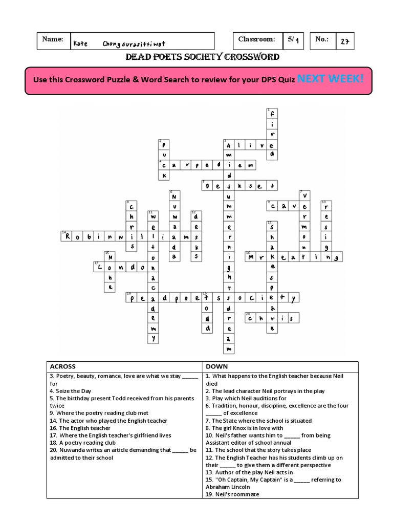Dead Poets Society Crossword Word Search PDF Word Search