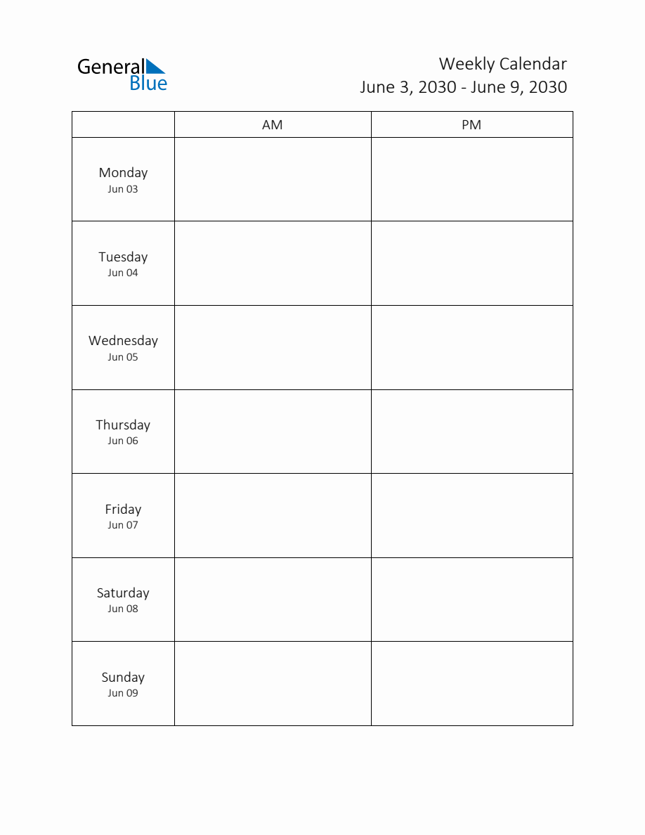 Printable Weekly AM PM Schedule Template Week 23 of 2030 (Jun 3 to Jun 9)
