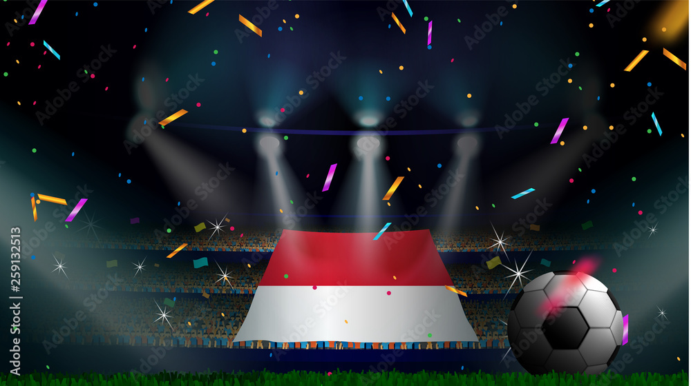 Fans hold the flag of Indonesia among silhouette of crowd audience in