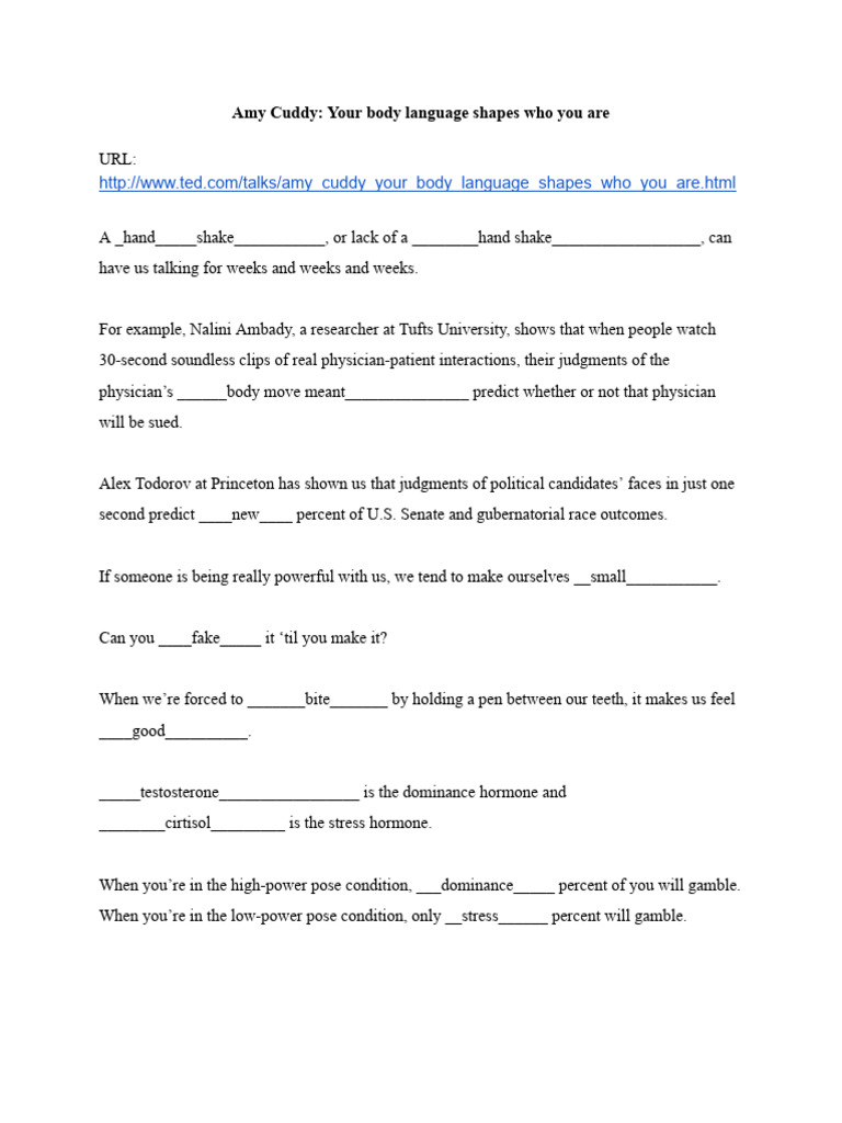 Ted Talk Worksheet / Body Language Amy Cuddy Ted Talk Esl Worksheet By