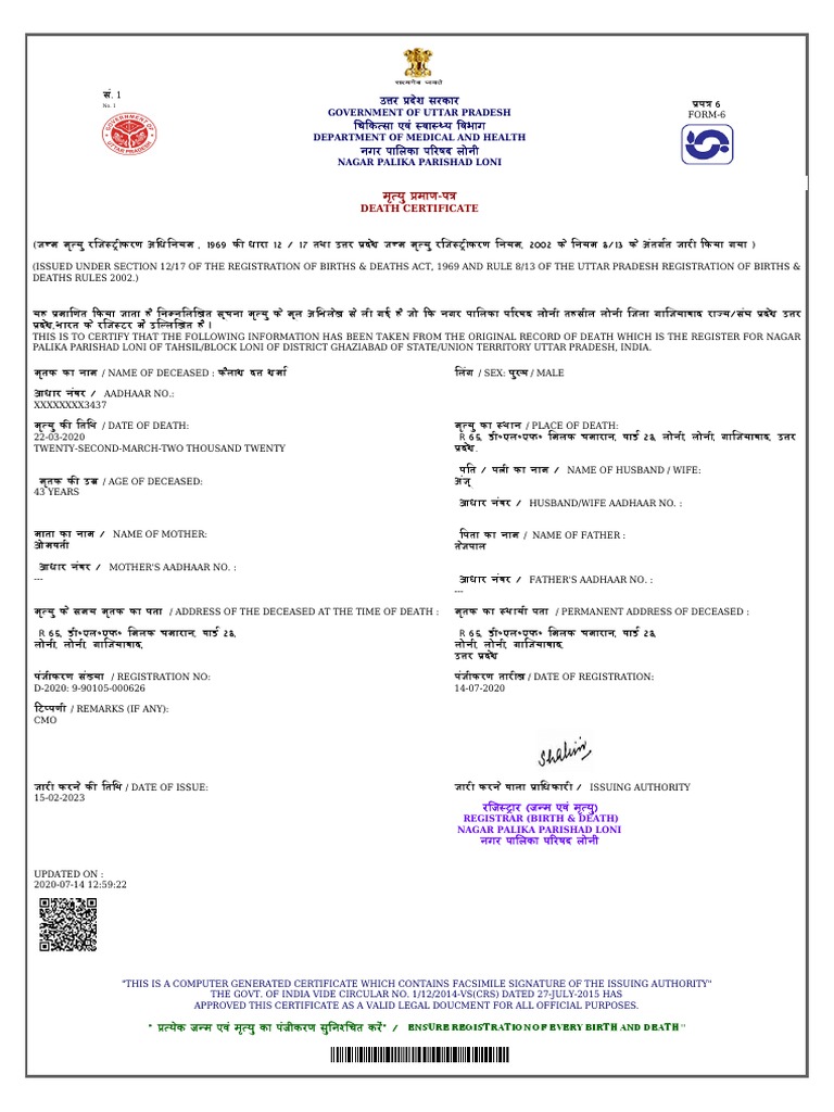 Death Certificate: Government of Uttar Pradesh Department of Medical
