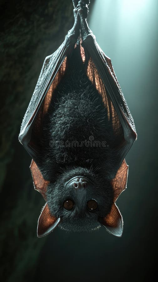 A vampire bat hanging upside down in a cave its eyes gleaming Premium