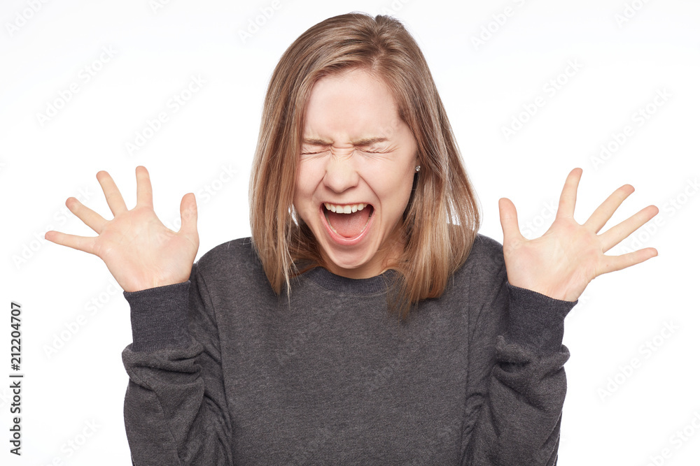 Annoyed female gestures angrily and shouts in annoyance being