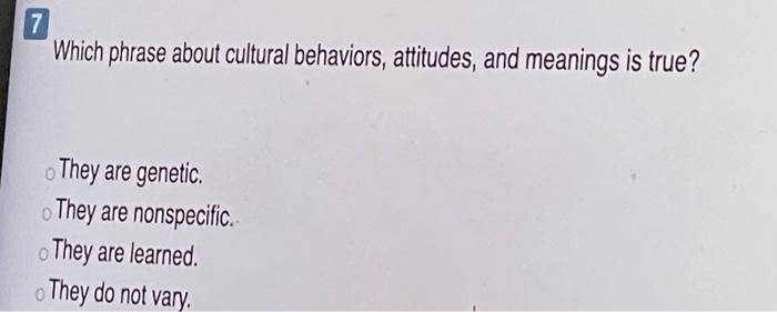 Solved 7 Which phrase about cultural behaviors attitudes Chegg com