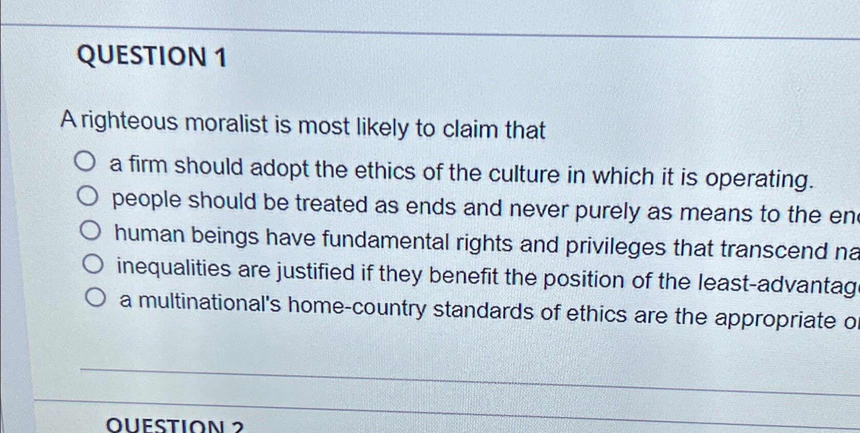 Solved QUESTION 1A righteous moralist is most likely to Chegg com