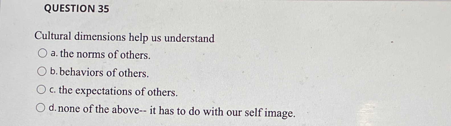 Solved QUESTION 35Cultural dimensions help us understanda Chegg com