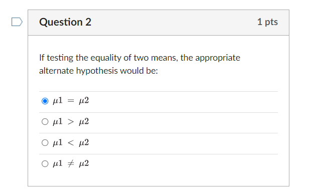 Solved Question 2 1 pts If testing the equality of two Chegg com