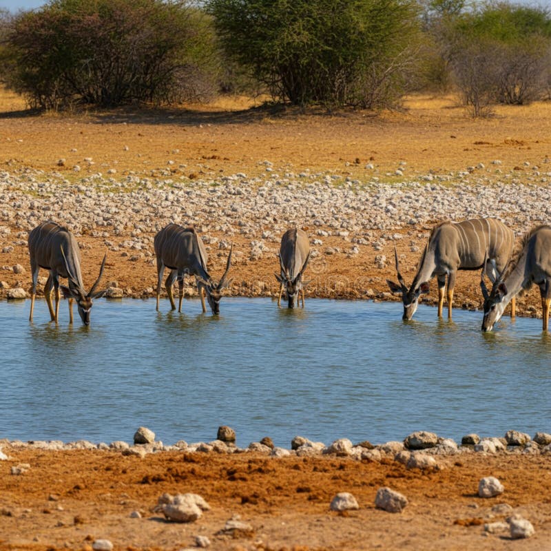 A Group of Antelopes is Drinking from a Small Waterhole in a Dry Rocky