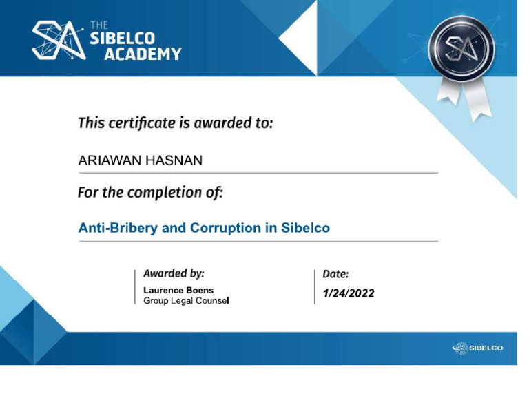 Certificate Anti Bribery and Corruption in SIbelco PDF