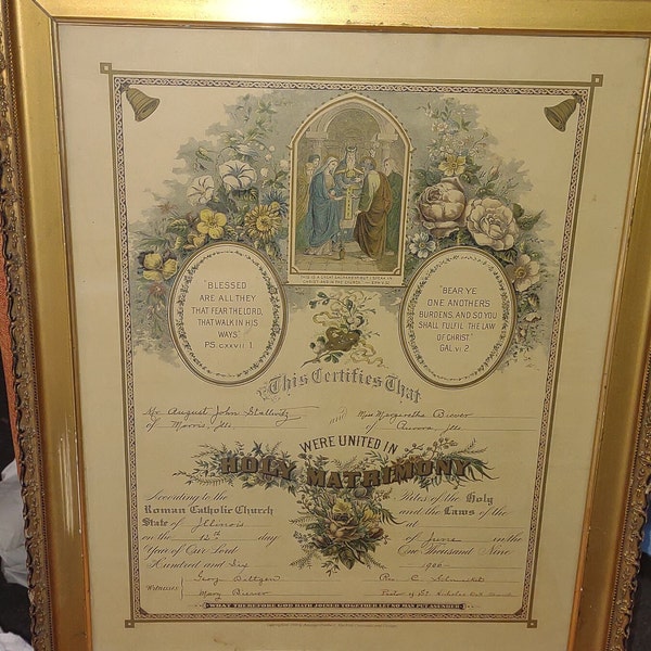 Antique Framed 1896 Marriage Certificate Memorial of Marriage Vintage