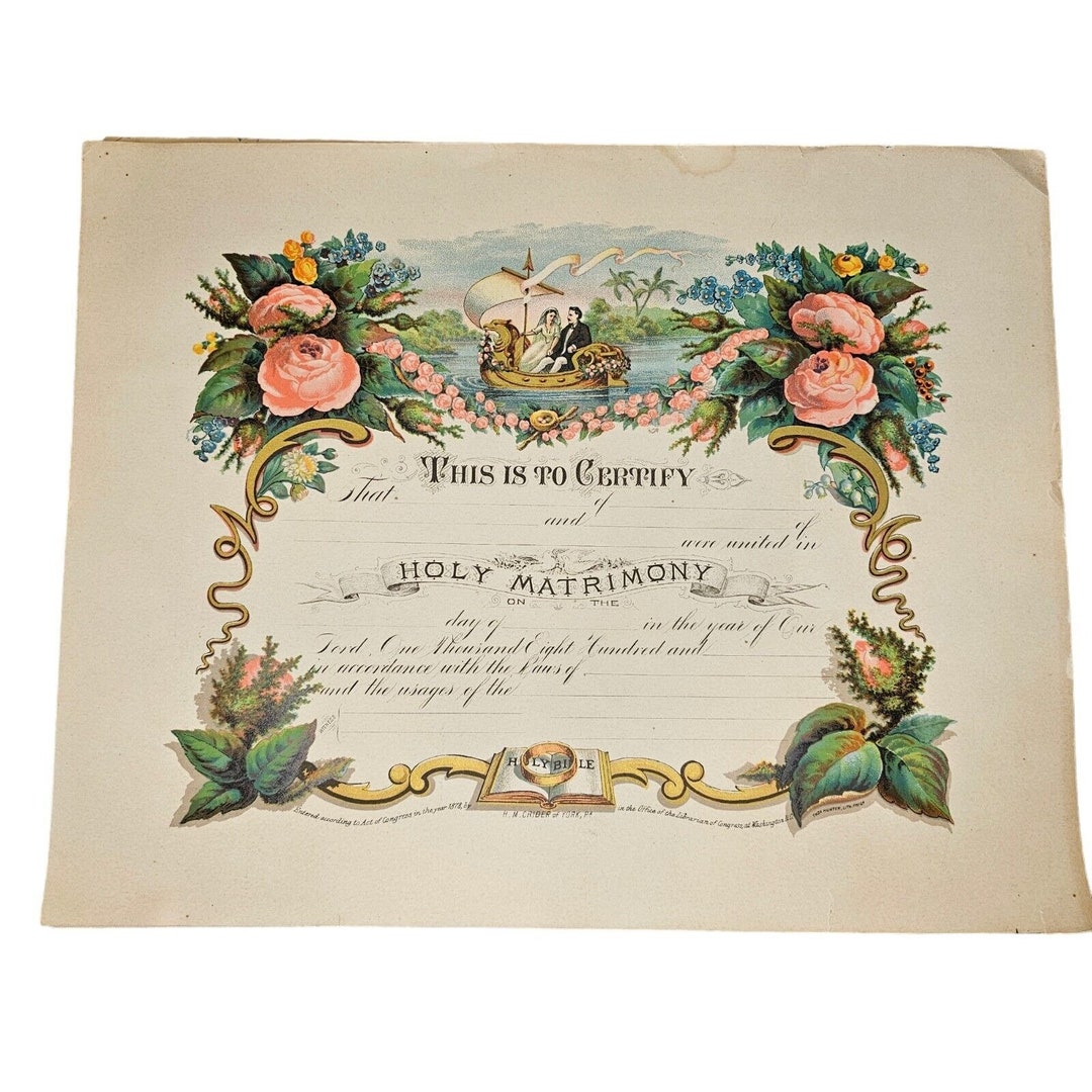 Antique Marriage Certificate Matrimony Lithograph blank 1870 s vintage
