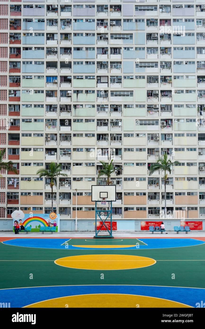Vibrant outdoor basketball court nestled amidst towering apartment