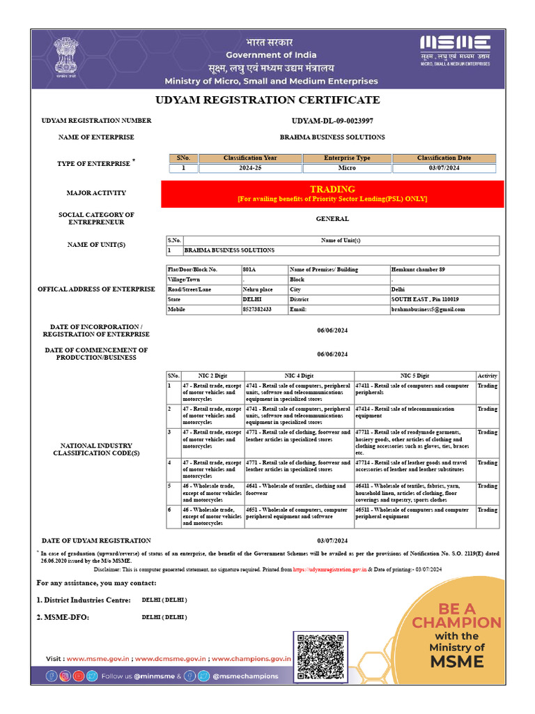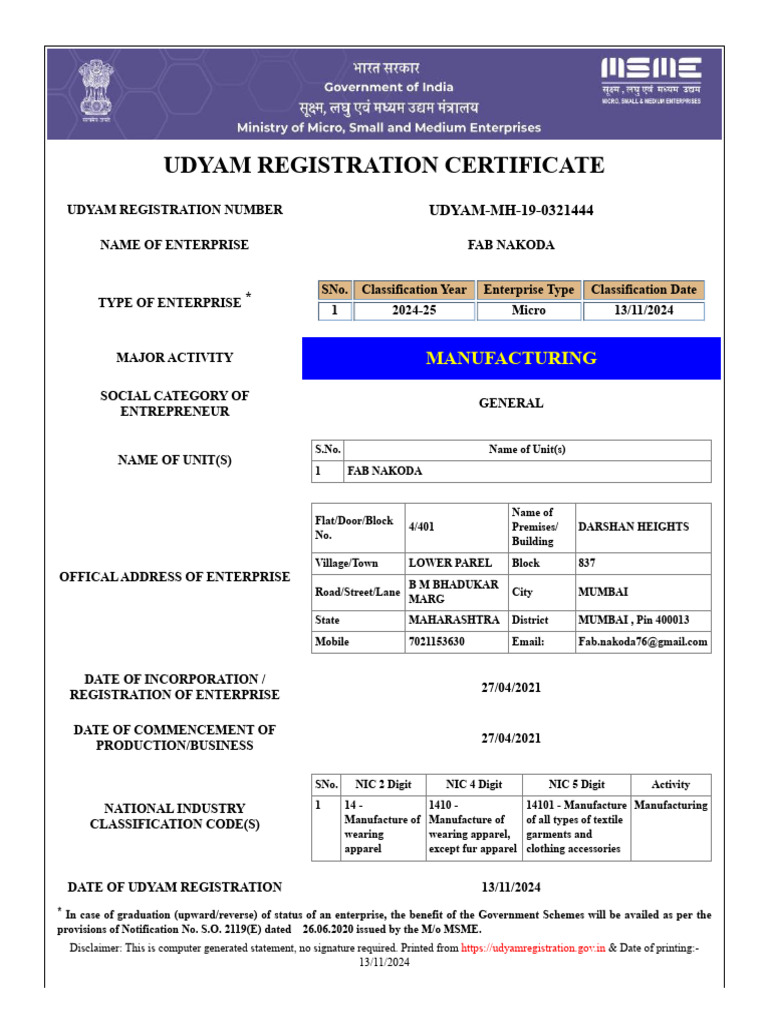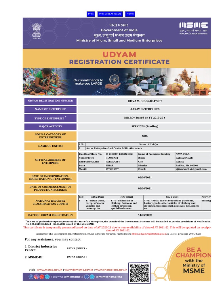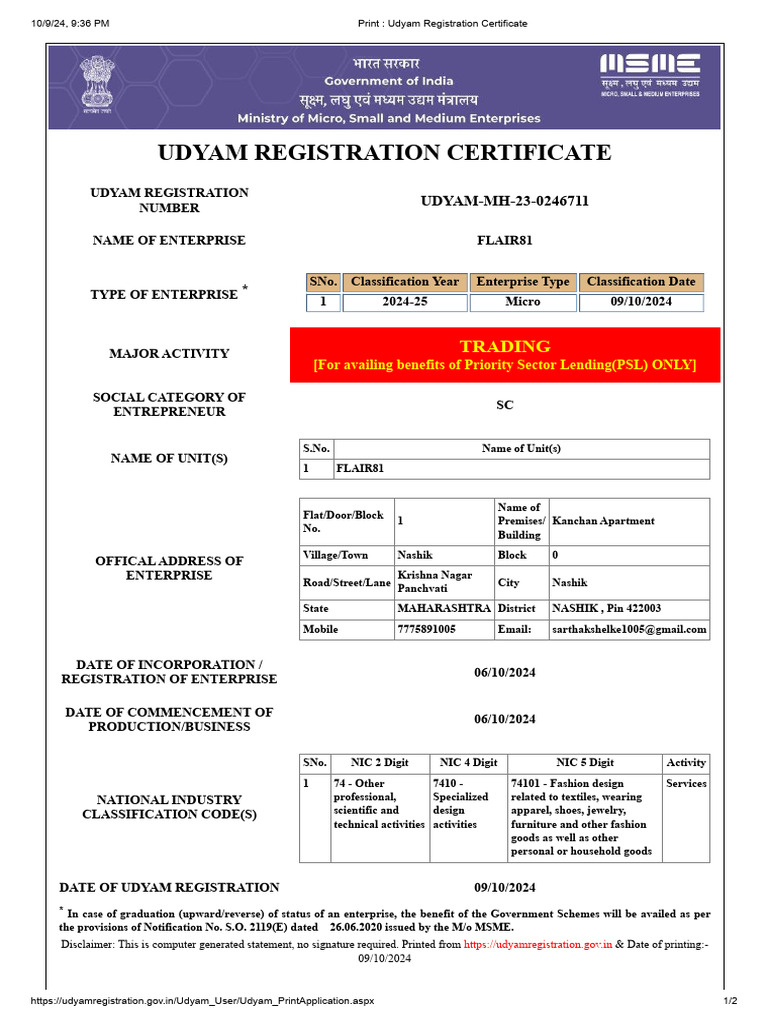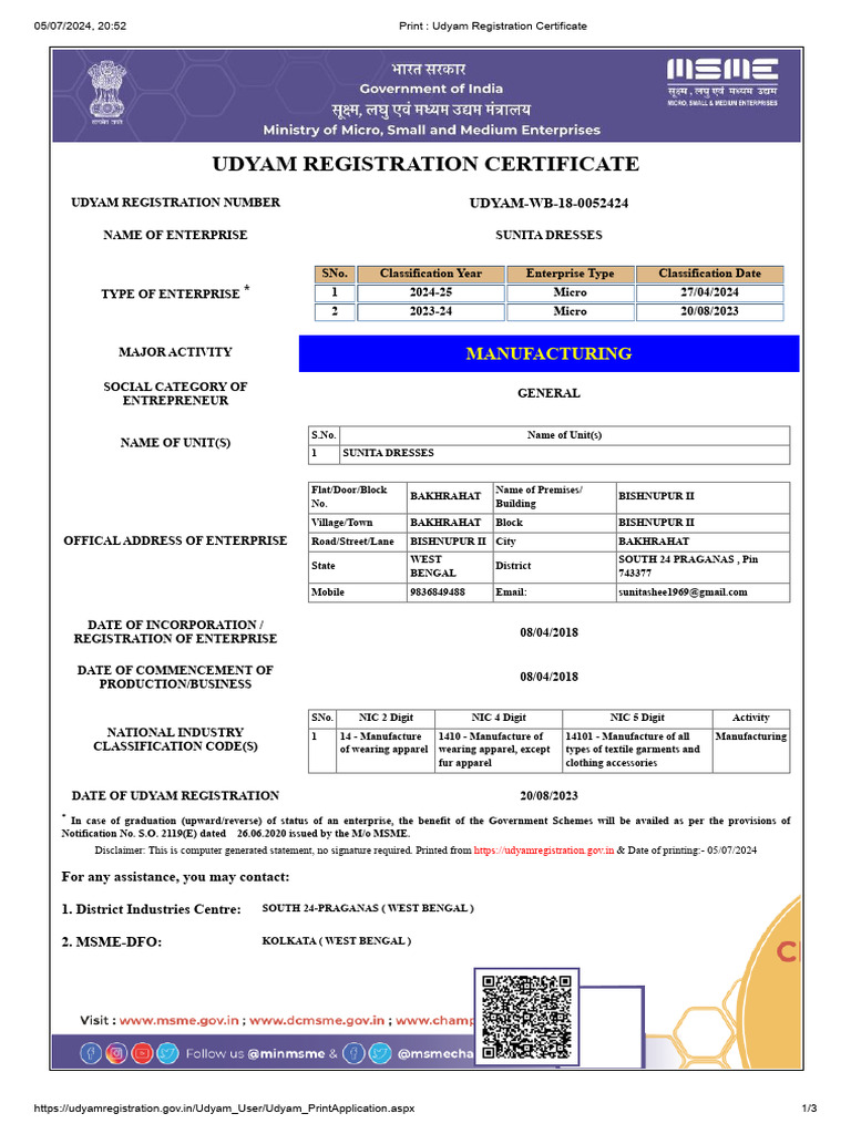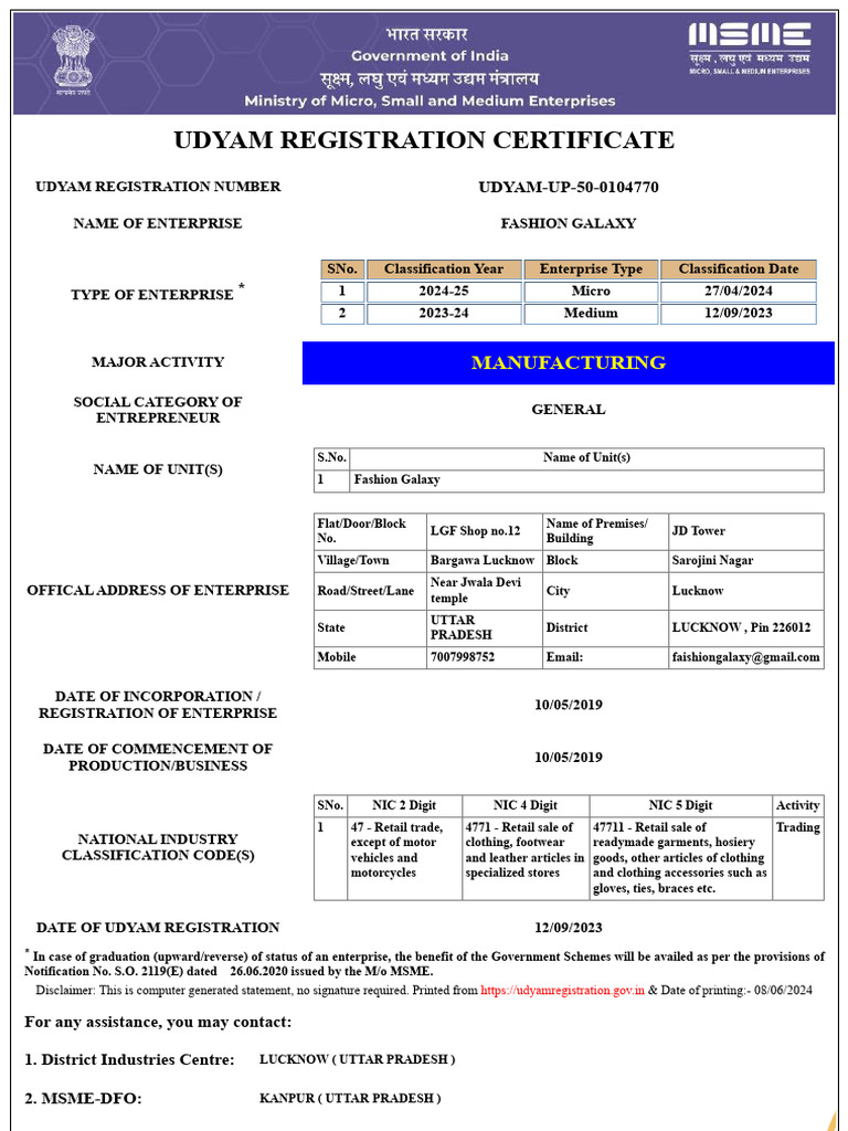 Print Udyam Registration Certificate PDF Fashion Clothing