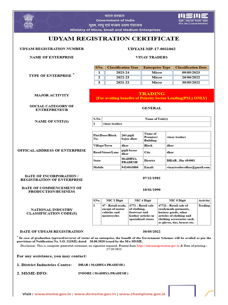 Print Udyam Registration Certificate VINAY TRADERS PDF Clothing