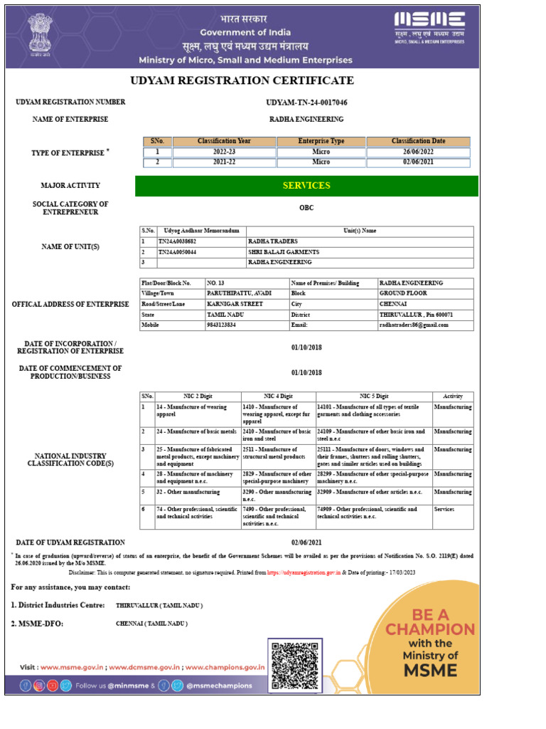 Udyam Registration Certificate RADHA ENGINEERING UPDATED SERVICES PDF