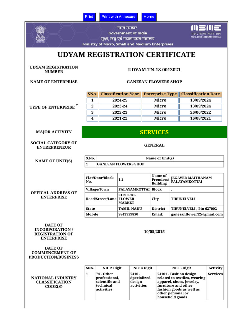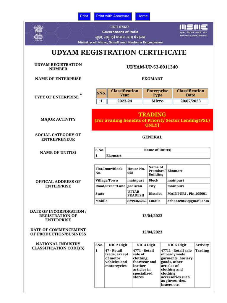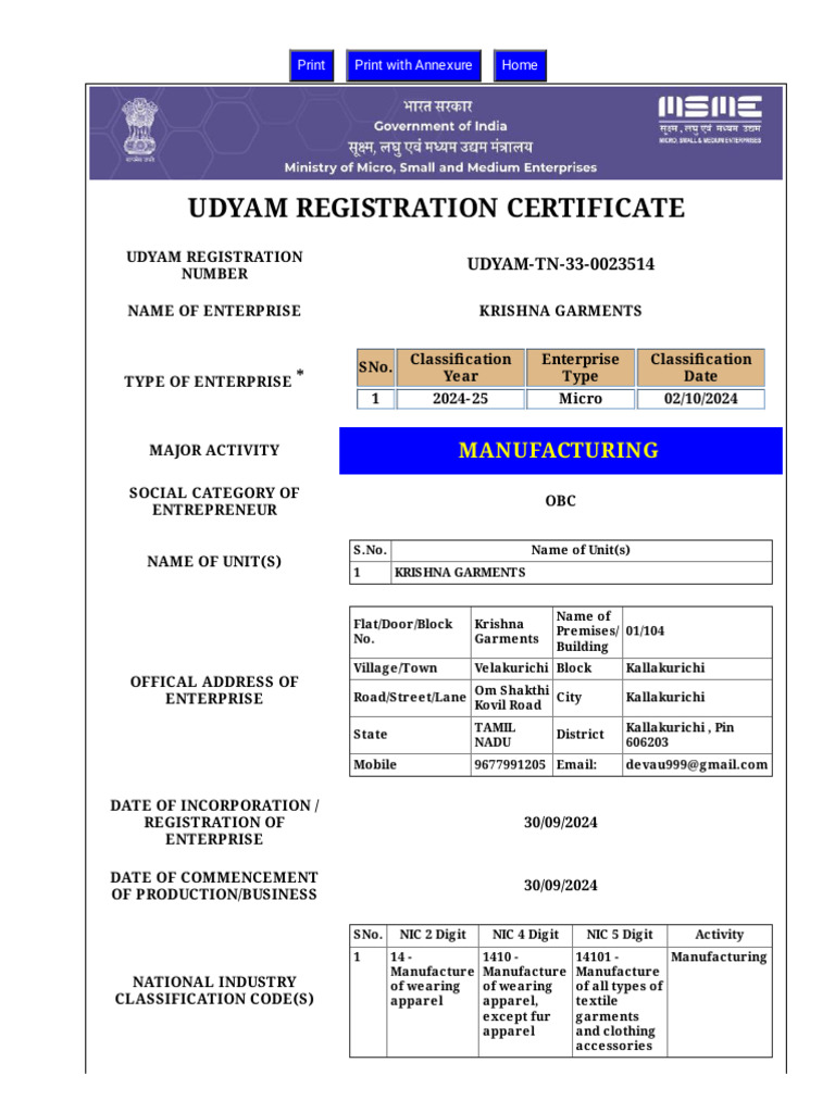 Print Udyam Registration Certificate Annexure PDF Clothing