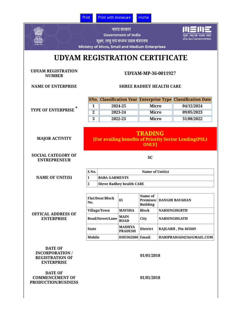 Print Udyam Registration Certificate Anil PDF Clothing