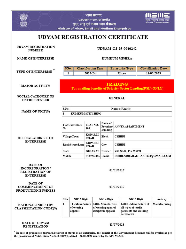 Udyam Registration Certificate PDF Clothing Fashion