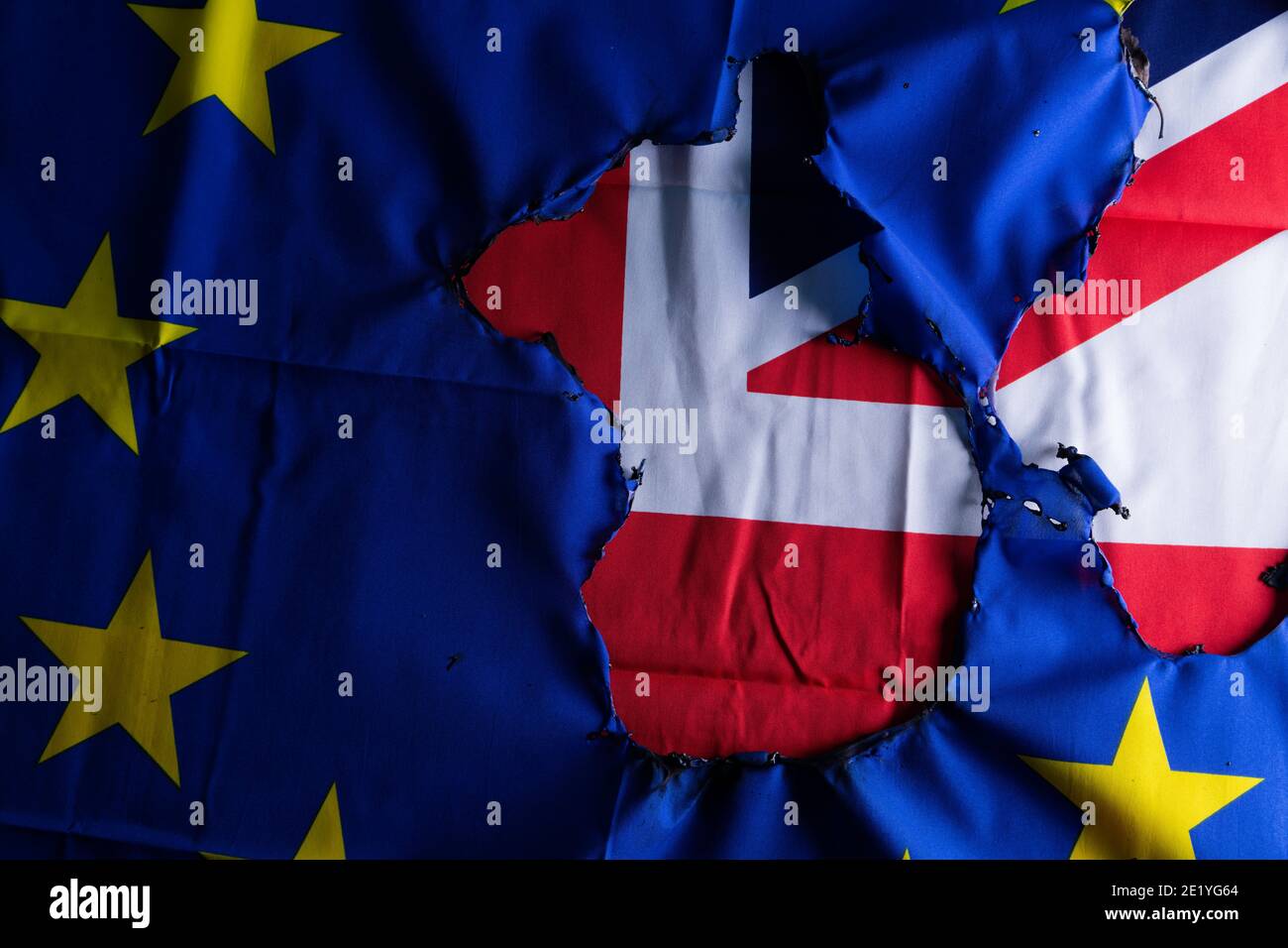 British flag appearing from behind a burnt EU flag Stock Photo Alamy