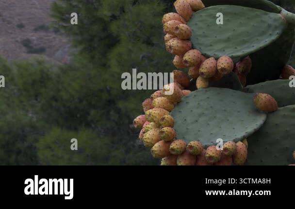 Bright orange and red prickly pear fruits grow on a cactus appearing