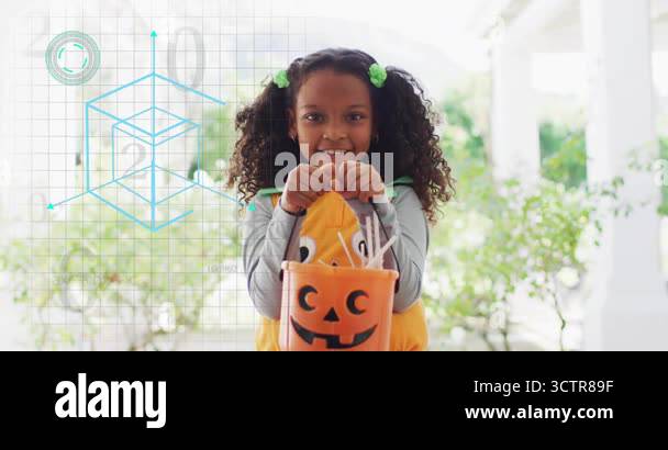 Girl gripping pumpkin bucket while 3D cube appearing causing math