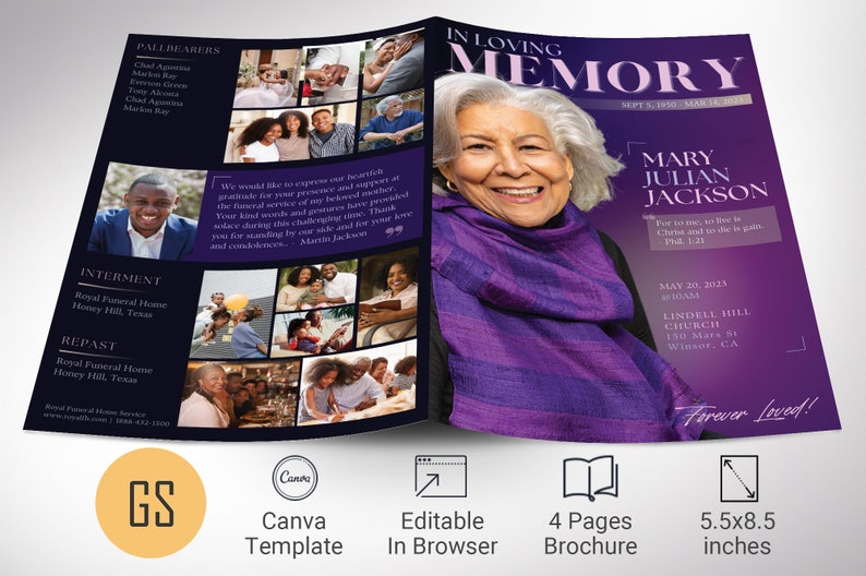Purple Funeral Program Template Canva 4 Page Magazine Style Obituary 5