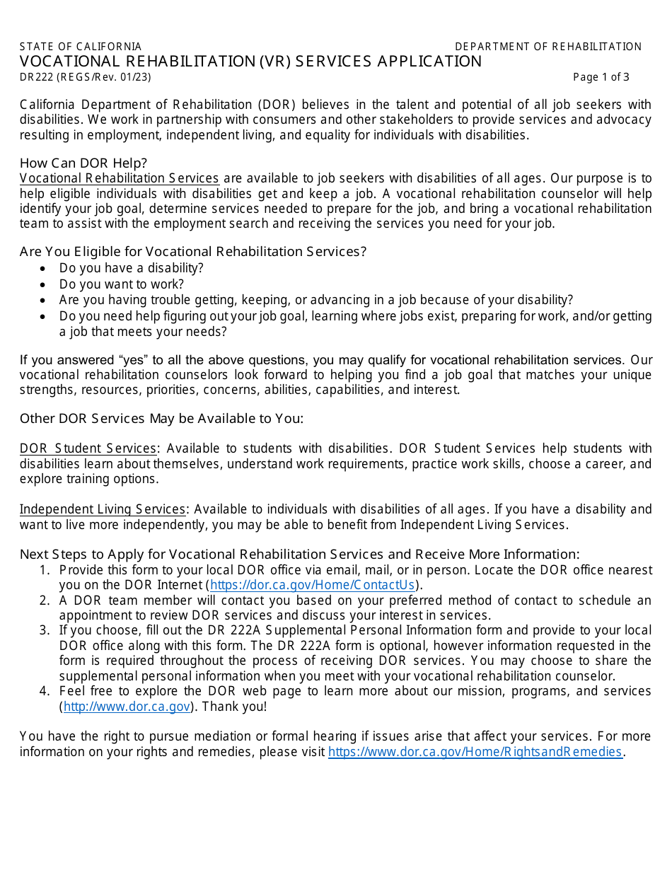 Form DR222 Download Fillable PDF or Fill Online Vocational