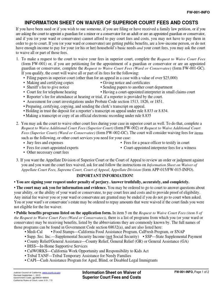 Information Sheet On Waiver of Superior Court Fees and Costs PDF