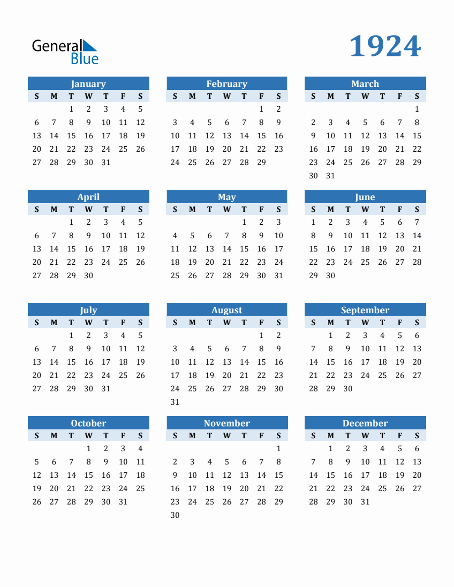 Download 1924 Printable Calendars