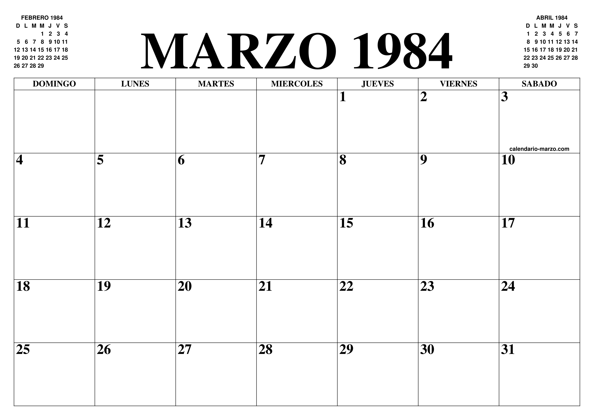 CALENDARIO MARZO 1984 : EL CALENDARIO MARZO PARA IMPRIMIR GRATIS MES