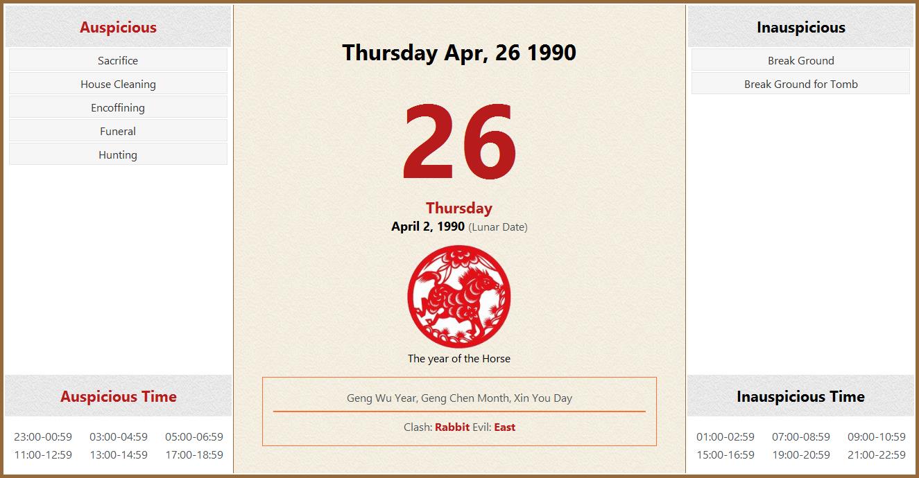 April 26 1990 Almanac Calendar: Auspicious/Inauspicious Events and