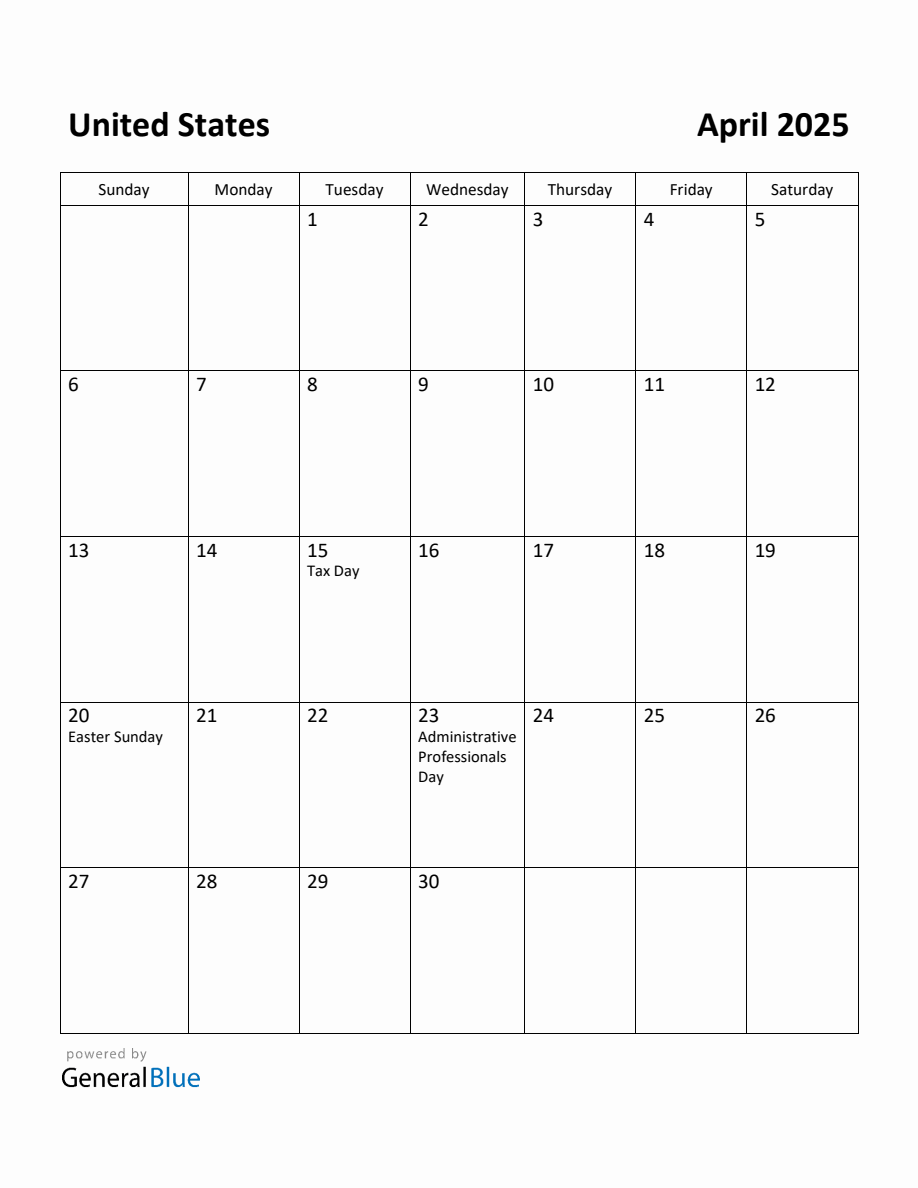 Free Printable April 2025 Calendar for United States