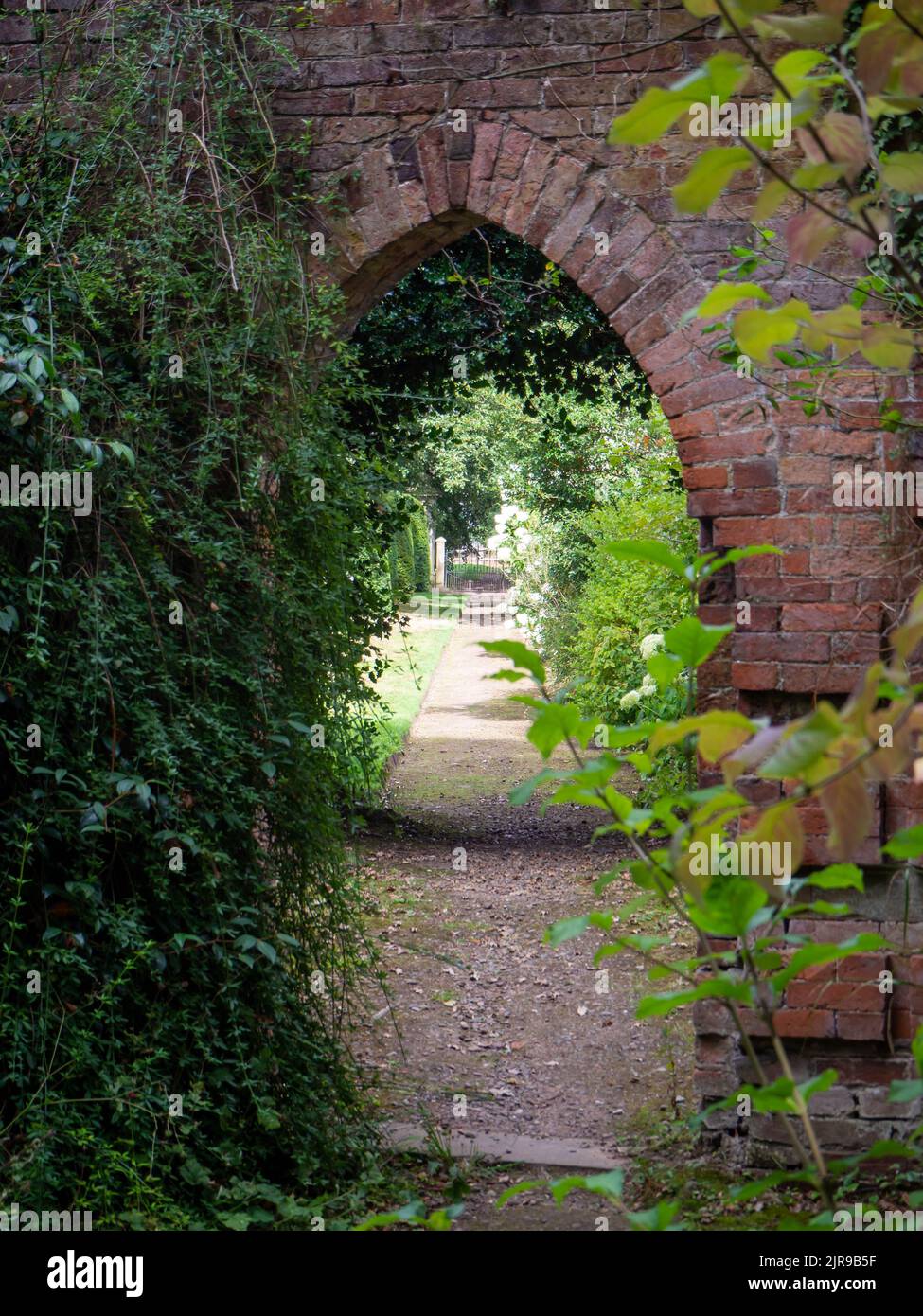 Path through old stone archway into trees and gardens beyond Stock